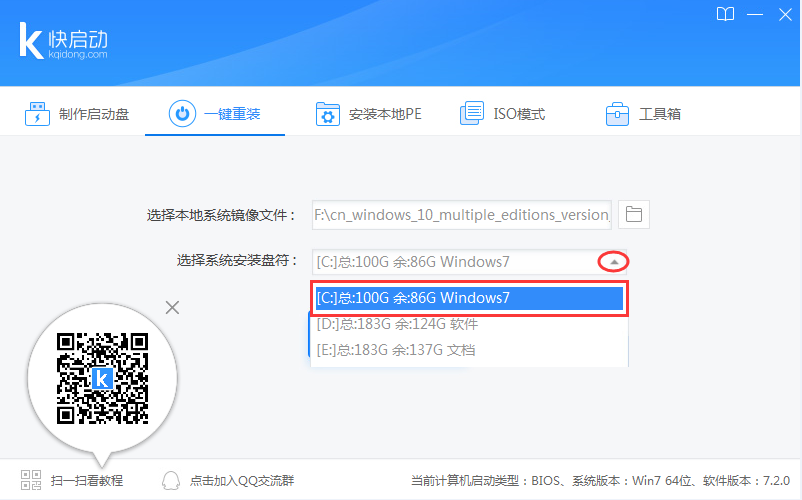 3、点击三角号下拉选择系统安装盘,如图所示: