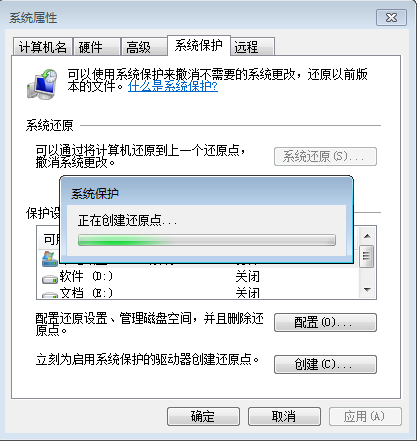 第五步:完成配置后,可以看见C盘的保护已经打开,点击“创建”进行还原点的创建。