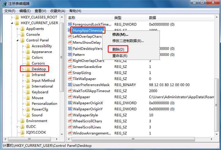2、打开注册表编辑器窗口后,依次展开“HEKY_CURRENT_USER\Control Panel\Desktop”,然后在右边键值列表中找到“HungAppTimeOut”项,接着单击鼠标右键选择“删除”,如下图所示: