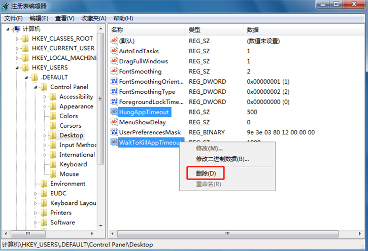 ①HKEY_USERS\.DEFAULT\Control Panel\Desktop\HungAppTimeOut