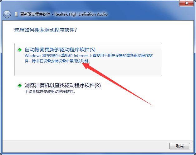 5、点击自动搜索更新的驱动程序软件,尝试更新声卡驱动程序,更新结束后即可恢复声音。