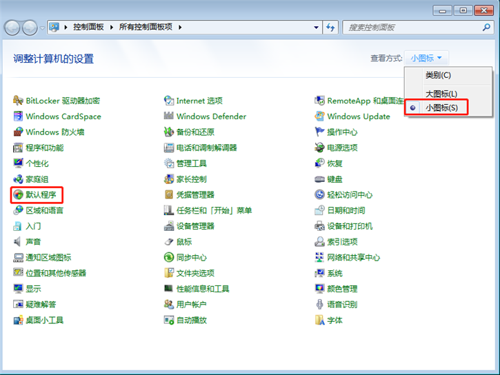 2、控制面板 - 所有控制面板项 ,按右上角的查看方式为小图标,选择并打默认程序;