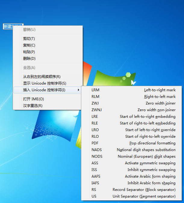 5、重命名这个透明文件夹名称的时候,我们可以右键点击插入 Unicode 控制字符,然后随便选择一项点击确定;