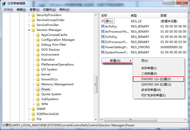 3、打开注册表编辑器后,依次展开:HKEY_LOCAL_MACHINE\SYSTEM\CurrentControlSet\Control\SessionManager\Power,紧接着在窗口空白处单击鼠标右键,选择新建“DWORD32位”的值;