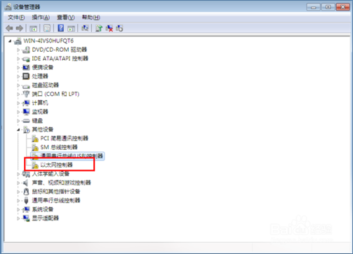 先确定电脑没有安装有网卡驱动,打开设备管理器,找到下图中红色方框内的选项,即“以太网控制器”。如果显示的是黄色标志就确定是不是网上没有安装成功导致电脑不能正常上网的。